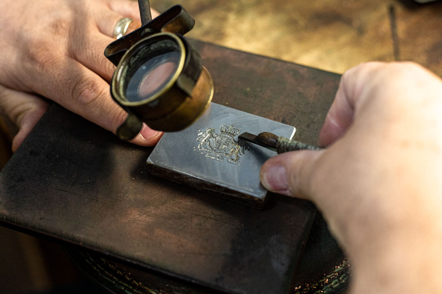 a master engraver carving a royal crest on a silver plate with tool and magnifying glass